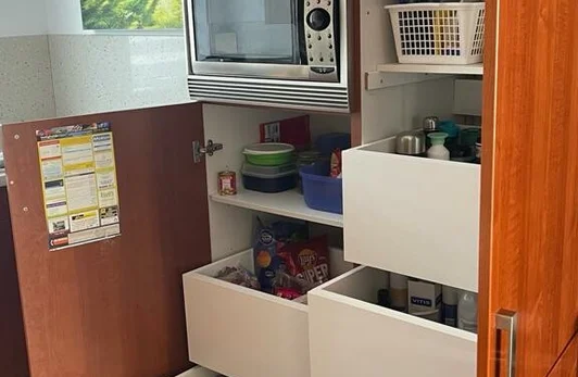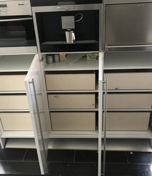 Een op maat gemaakte lade met geleiders die 40 kg kunnen dragen, plaatsen wij achter uw bestaande deurtjes.